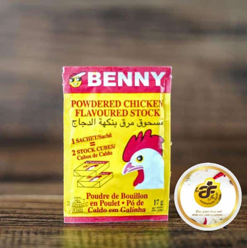 Benny Powdered Flavoured Stock features 1 sachet / sache which equals to 2 stock cubes .